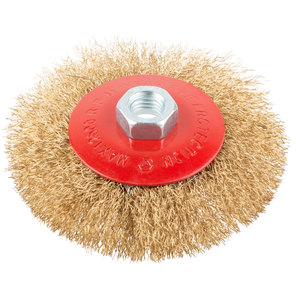 Корщетка, тип "колесо" с наклоном, гайка М14, стальная волнистая латунированная проволока 100 мм