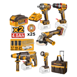 Набор аккумуляторного инструмента: дрель-шуруповерт, гайковерт, углошлифовальная машина, перфоратор, фонарь