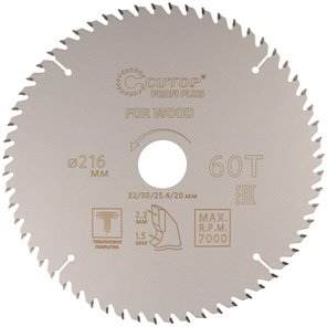 Диск пильный по дереву с тефлоновым покрытием 60Т, Profi plus, 216х1,5/2,2х32/30/25,4/20 мм