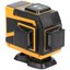 Самоуспокаивающийся. 3 зеленых луча на 360°: 2 вертикальных и 1 горизонтальный. Два уровня яркости луча - для внутренних и наружных работ. Максимальный рабочий диапазон до 20 м в каждую сторону. Функция фиксирования на поверхности креста из лазерных линий (а также отдельно горизонтальной или вертикальной линий). Функция отвеса вверх/вниз. Функция раздельного включения линий. Встроенный пузырьковый уровень. В комплекте пульт дистанционного управления, действующий на расстоянии до 15 м. С помощью держателя с магнитами и платформы для вертикального подъема можно располагать уровень в необходимой позиции. Диапазон компенсирования ±3° для установки на неровную поверхность. Внутренняя резьба 1/4" сверху и снизу на корпусе. Поворотная база с внешней резьбой 1/4" и с внутренней резьбой 5/8" для установки на треногу. В комплекте: лазерный уровень, пластиковый кейс с поролоновыми вставками, поворотная база, платформа для вертикального подъема уровня, держатель с магнитами, стальная пластина для крепления держателя к вертикальной поверхности, очки, зарядное устройство (230 В / 50 Гц), Li-Ion аккумуляторная батарея, пульт управления. Материал: ударопрочный ABS пластик, пластик, алюминиевый сплав, инструментальная сталь, поролон, резина. Упаковка: пластиковый кейс.